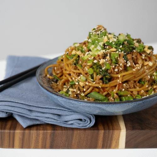 Plate the noodles and top with sliced scallions, chopped peanuts, and sesame seeds. Serve immediately.