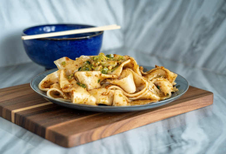 Pour the sauce over the noodles in each bowl. Top the noodles with a pile of the aromatics: the minced garlic, sliced scallions, ground Sichuan peppercorns, and red chili flakes.