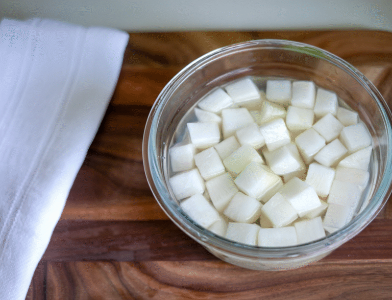 Add the radish cubes to the container. Make sure the cubes are fully submerged in the pickling liquid. Seal the container and give it a good shake to make sure everything is mixed.