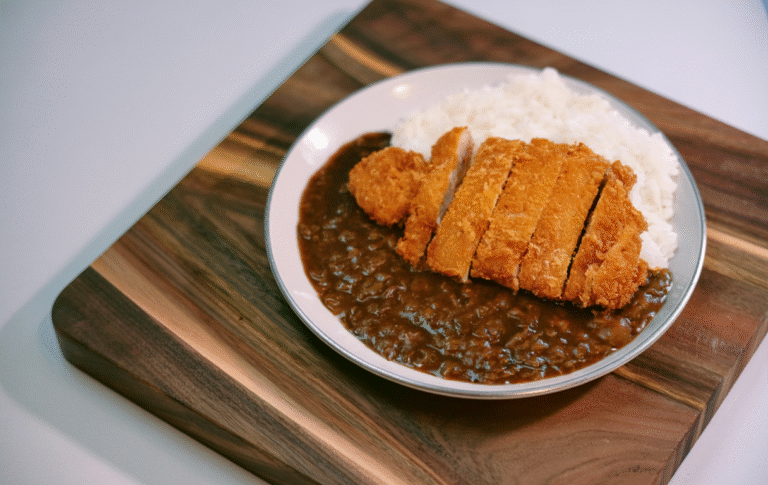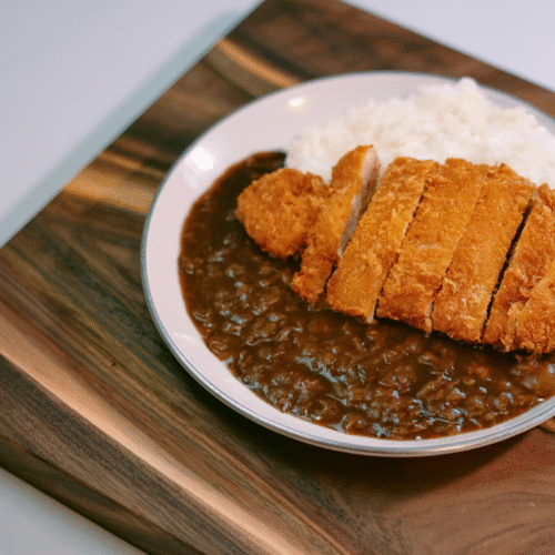 Serve a portion of steamed rice on a plate, place a sliced pork cutlet next to it, and ladle a generous amount of the black pepper curry sauce over the katsu and rice.