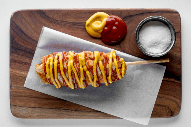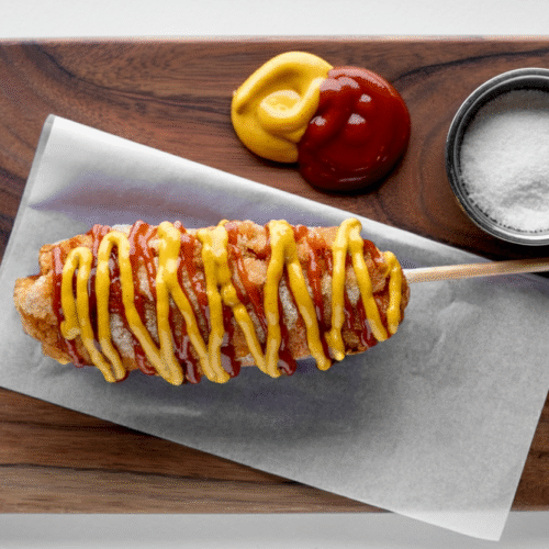 Remove the corn dog to a wire rack to drain. Immediately sprinkle it generously with sugar. Serve hot with ketchup and mustard.