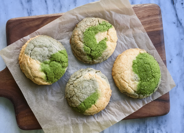 These cookies have three distinct flavors in one – kinako (roasted soybean flour), matcha, and black sesame all pressed together but not mixed. You make one base dough, divide it, add the different powders, then gently combine them so each bite has all three flavors but they stay visually separate