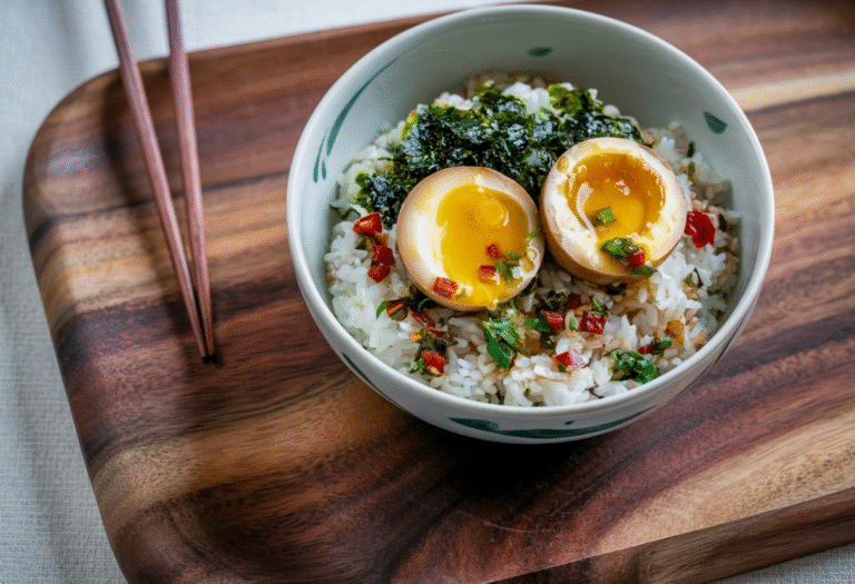 When you’re ready to eat, serve an egg over a bowl of hot rice, drizzle with a little toasted sesame oil, and spoon some of the marinade and aromatics over the top.