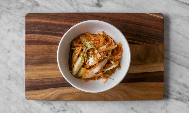 Real kimchi is a 2-stage process – salt the cabbage for hours to draw out water and make it pliable, then coat every single leaf with this paste made from rice flour slurry, gochugaru, and fermented shrimp. Day 1 it tastes fresh and spicy, but by week 2 it's got that perfect funk that makes it addictive.