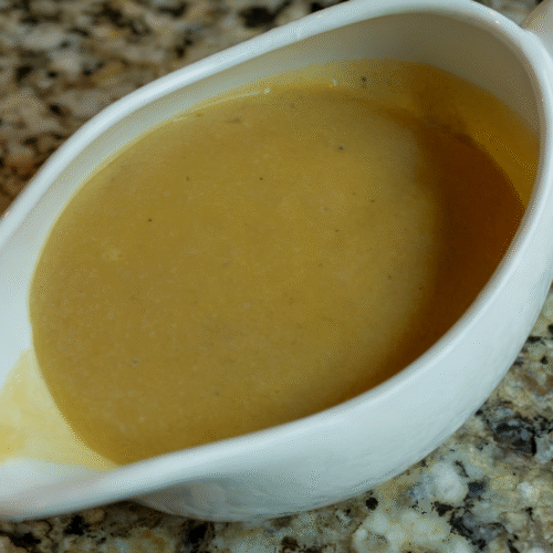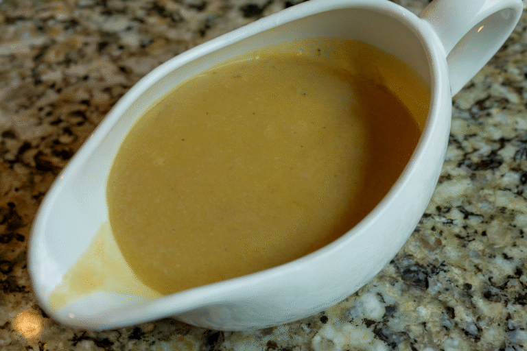 Pour the finished gravy through a fine-mesh sieve into a gravy boat or bowl. This step is optional but ensures a perfectly smooth, lump-free texture.