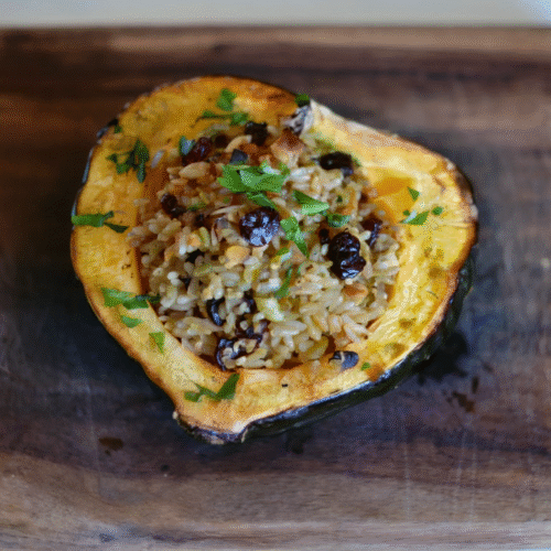 Spoon the stuffing into the cavity of each roasted acorn squash half.