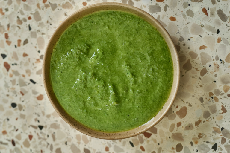 - With processor running, slowly stream in olive oil until desired consistency is reached.