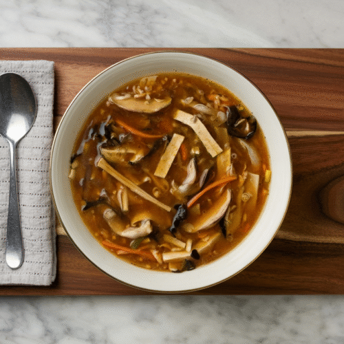 Hot and sour soup gets its signature flavor from white pepper and black vinegar added at the very end - if you add them too early, the heat and acid cook off. The thickness comes from a serious amount of cornstarch slurry, way more than you'd think you need.